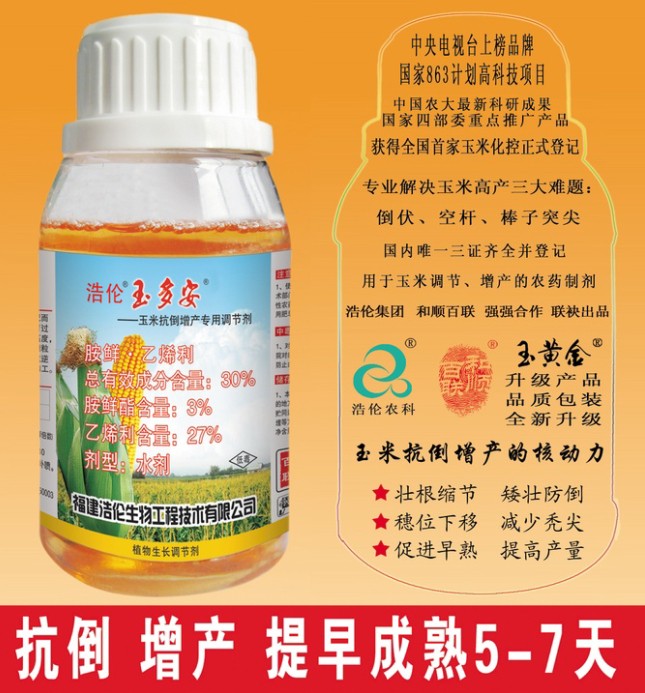 玉多安是由中國農(nóng)業(yè)大學(xué)作物化控中心和浩倫農(nóng)業(yè)科技集團(tuán)針對玉米生產(chǎn)多年來存在的倒伏、禿尖、空桿等問題,聯(lián)合研究開發(fā)的一種玉米專用調(diào)節(jié)劑。