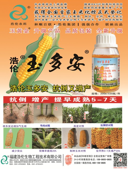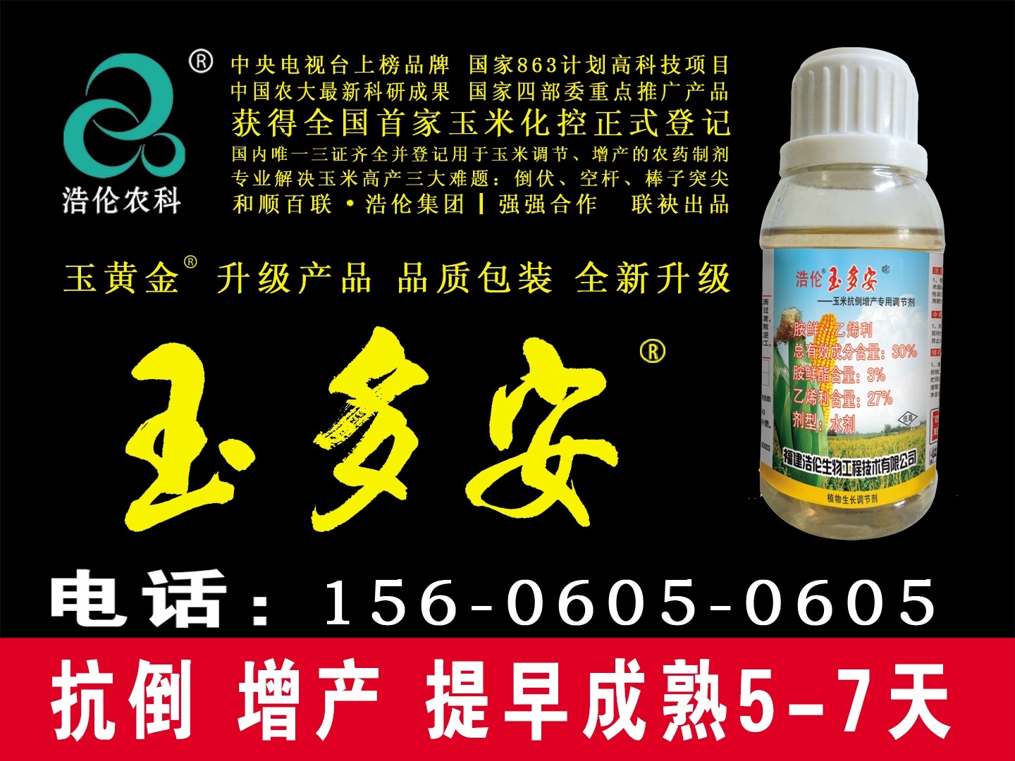 玉多安是由中國農(nóng)業(yè)大學(xué)作物化控中心和浩倫農(nóng)業(yè)科技集團(tuán)針對玉米生產(chǎn)多年來存在的倒伏、禿尖、空桿等問題,聯(lián)合研究開發(fā)的一種玉米專用調(diào)節(jié)劑。